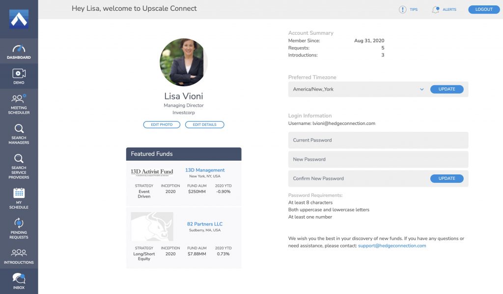 Upscale is lead by industry veteran Thomas Zucosky. With many decades of experience in alternatives, he and the team have created a platform designed intimately with the allocator mindset – understanding their needs for privacy, security, and fund data.