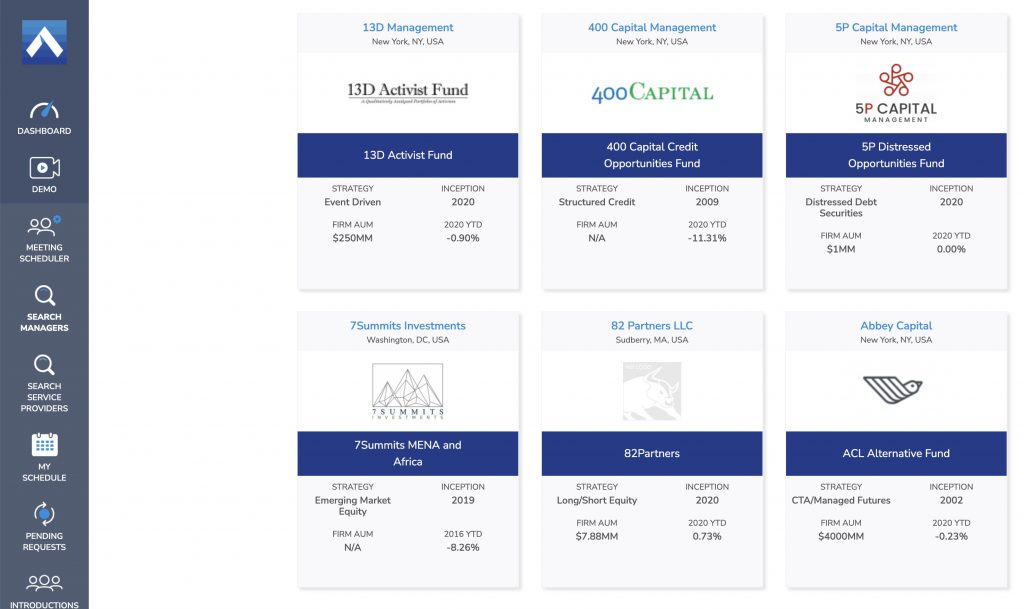 Meeting scheduler…Our matching algorithm automatically surfaces allocators looking to invest in strategies like yours. You can browse, filter, analyze, and send messages or meeting requests.